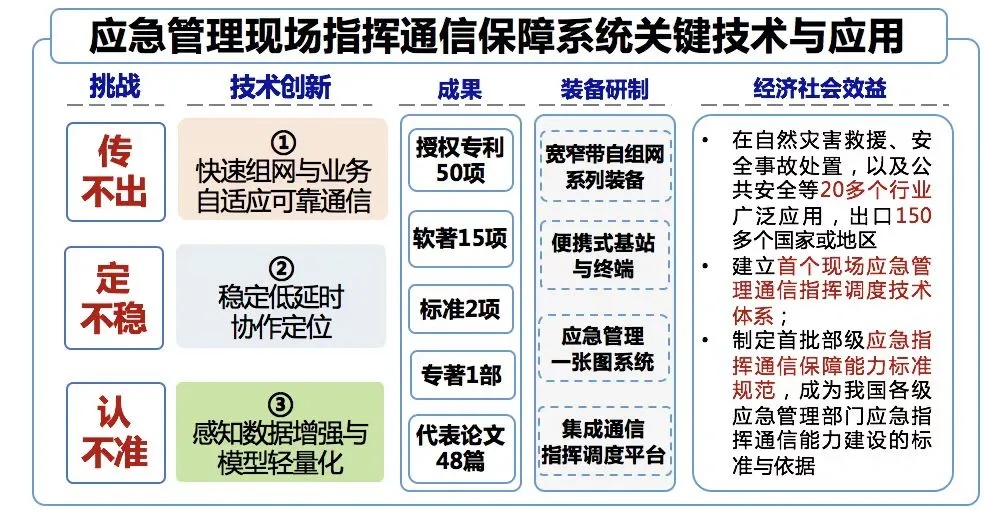 应急管理现场指挥通信保障系统关键技术及应用(第一完成人:王莉教授)获中国电子学会科学技术奖科技进步一等奖。该项目围绕重大自然灾害和事故救援中的现场指挥通信重难点问题,突破快速组网与业务自适应可靠通信、稳定低延时协作定位、感知数据增强等关键技术,建立了我国首个现场应急管理通信指挥调度的技术体系,研制了宽窄带自组网、融合通信指挥调度平台等系列设备,显著增强国家重大自然灾害和事故处置高效精准的应急通信保障能力。