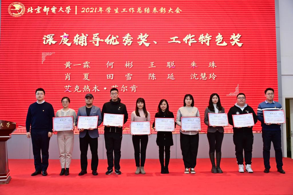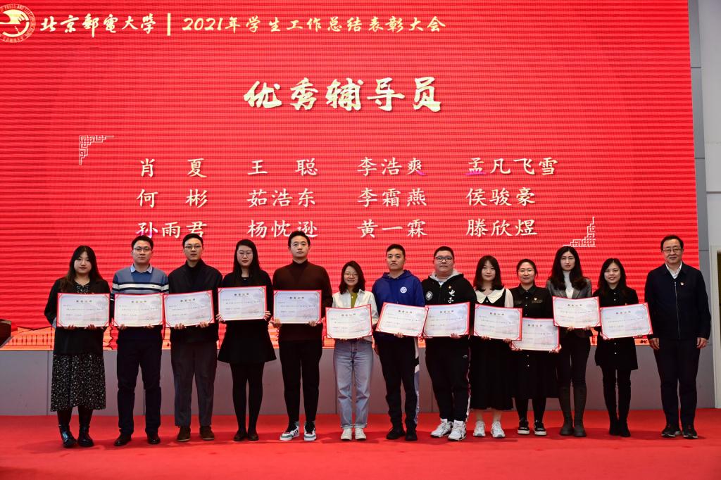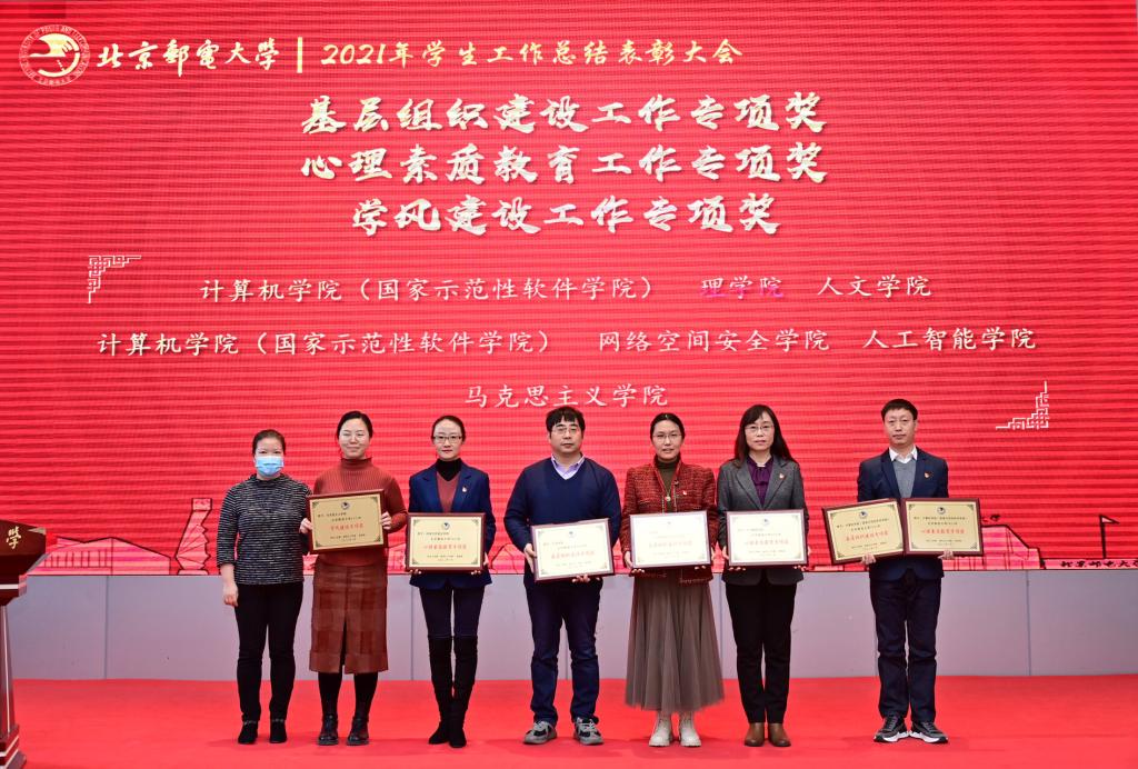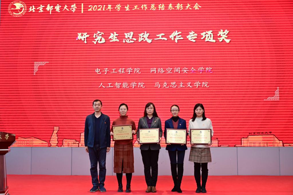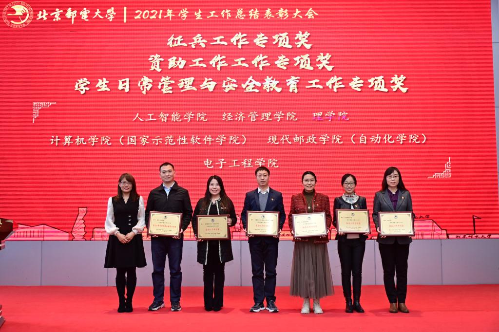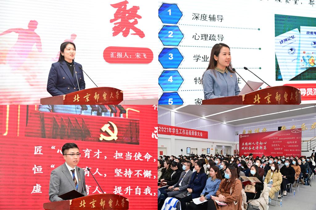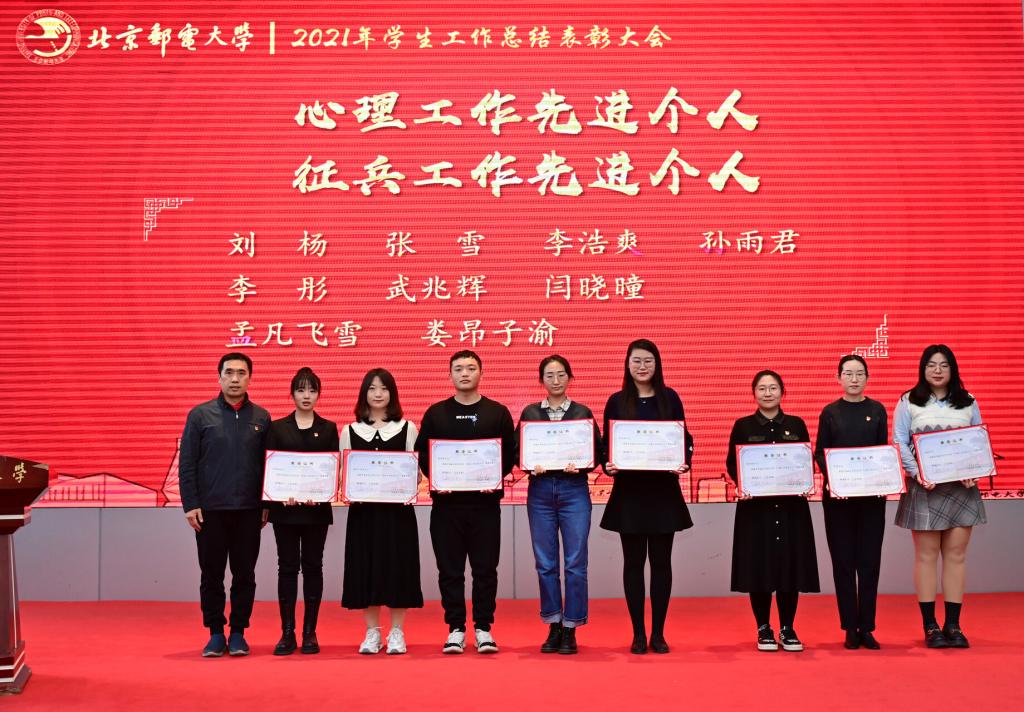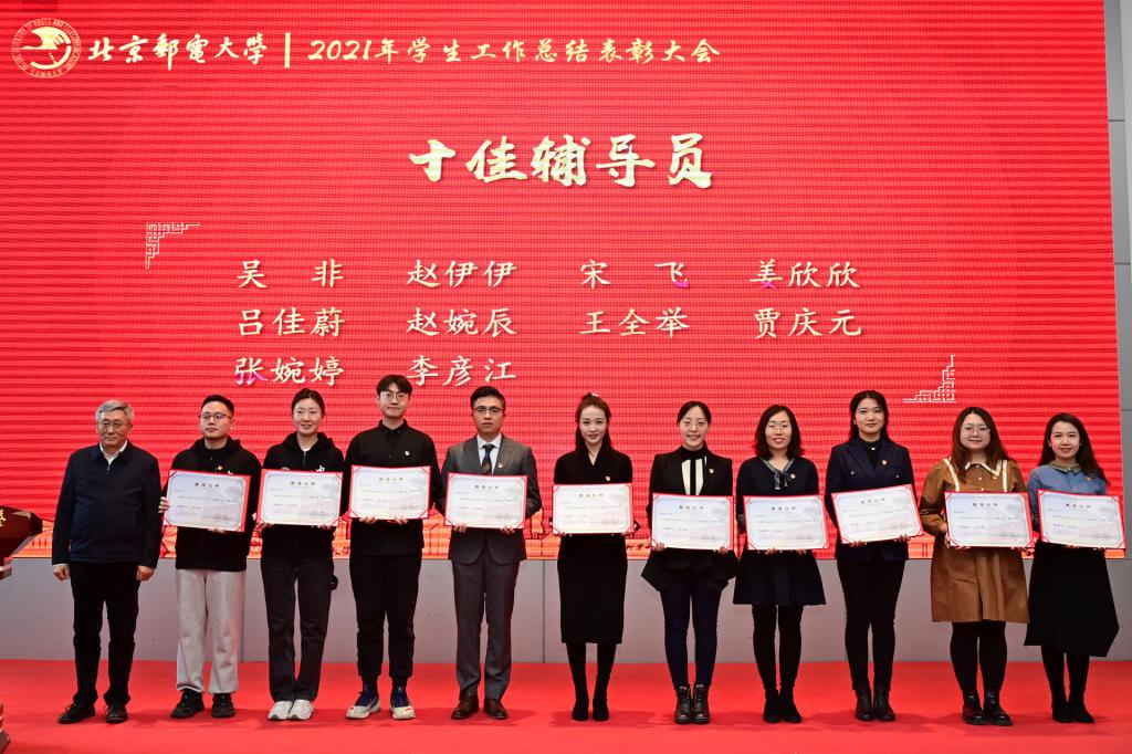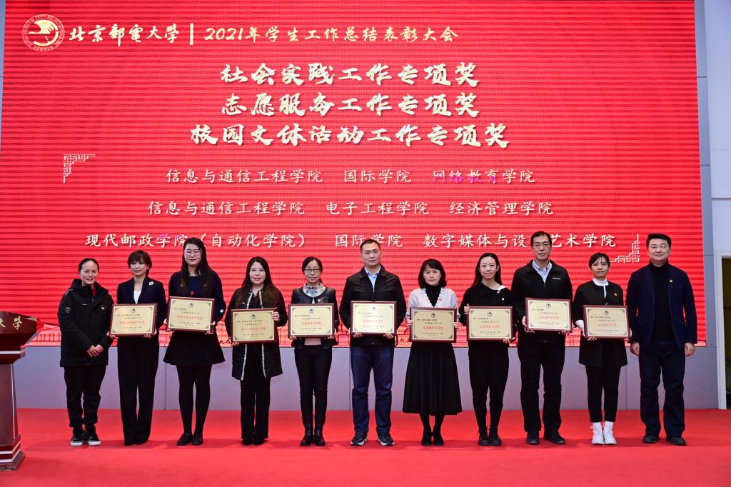 全体参会人员共同观看了《北京邮电大学2021年学生工作纪实》,回顾过去一年在各项学生工作中取得的丰硕成果。研究生工作部部长、研究生院常务副院长冯志勇宣读表彰决定,授予计算机学院(国家示范性软件学院)等4个学院本科生思政工作专项奖,电子工程学院等4个学院研究生思政工作专项奖,理学院等3个学院基层组织建设专项奖,信息与通信工程学院等11个学院就业工作先进集体,网络空间安全学院等3个学院心理素质教育专项奖,马克思主义学院学风建设专项奖,现代邮政学院(自动化学院)等2个学院资助工作专项奖,电子工程学院学生日常管理与安全教育专项奖,人工智能学院等3个学院征兵工作专项奖,国际学院等3个学院社会实践专项奖,经济管理学院等3个学院志愿服务专项奖,数字媒体与设计艺术学院等3个学院校园文体活动专项奖。表彰吴非等10位十佳辅导员、肖夏等12位优秀辅导员、黄一霖等4位深度辅导优秀奖获得者、陈延等5位工作特色奖获得者、赵伊伊等10位爱心使者奖获得者、倪妍等5位学生管理工作先进个人,张雪等4位心理工作先进个人、王欣等5位就业工作先进个人、张春香等4位资助工作先进个人、孟凡飞雪等5位征兵工作先进个人、李萍等5位思政进科研团队工作先进个人。吴建伟书记、赵纪宁副书记,各职能部门领导为先进集体和优秀个人进行颁奖。