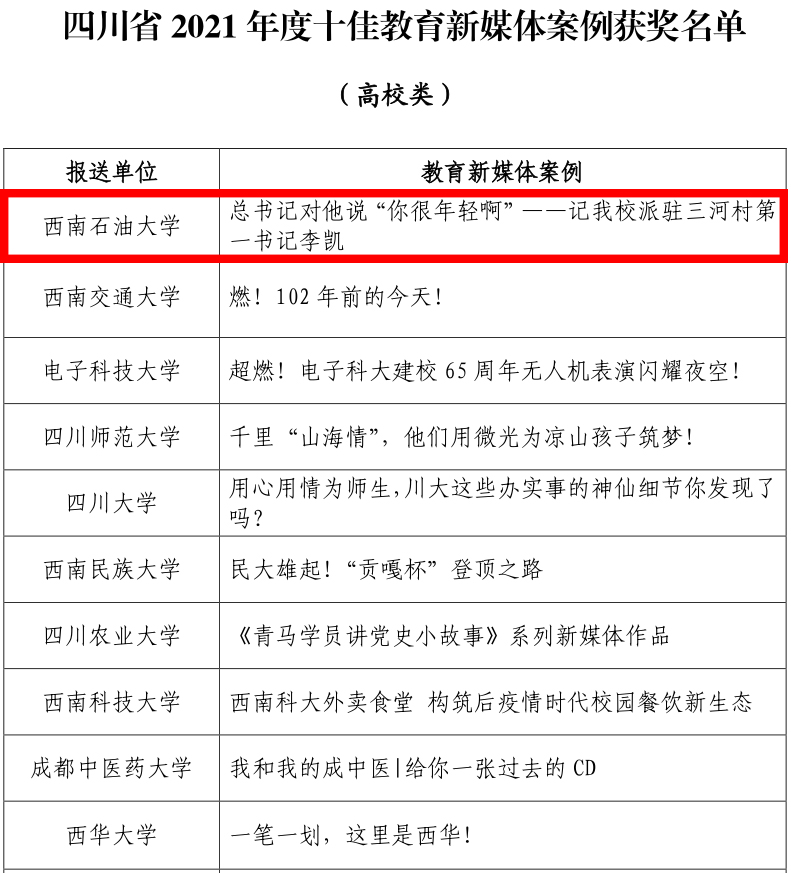 2021年12月,省委教育工委、省教育厅开展了此项案例征集评选活动,邀请省直机关有关部门处室负责同志、中央驻川和川内部分新闻媒体单位记者组成评审组,对各地各校选送作品进行评选,最终从省内近百所高校报送的作品中遴选产生出十佳教育新媒体案例。其中,我校与四川大学、电子科技大学、西南交通大学等十所高校的作品名列其中,体现出我校官方新媒体作品质量和影响力的显著提高。