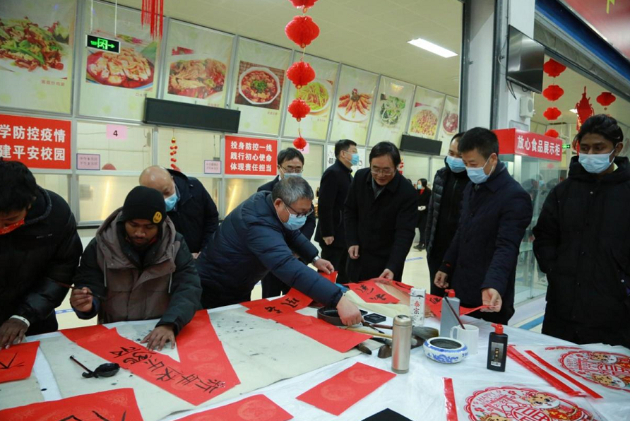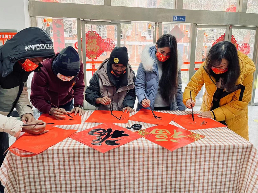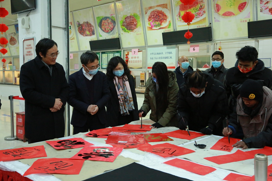 校领导分别向留校学生和后勤集团在岗职工送上了新年礼包,叮嘱留校的同学们做好个人假期规划,注意身体健康,祝福大家过一个平安、充实、愉快的春节。现场气氛暖意融融,师生们一起挥毫泼墨写春联,写“福”字,留学生们书写的“新年快乐”跃然纸上,洋溢着浓浓的喜庆。一副副春联、一张张福字,满载着老师和同学们的对新的一年的美好祝福。