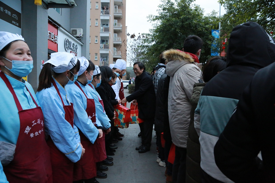 校领导首先来到学校香樟餐厅看望慰问留校学生和后勤集团在岗职工,并与大家共享早餐。香樟食堂一楼张灯结彩,处处充满着浓厚的年味。