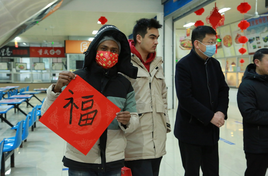 寒假留校期间,国际交流与合作处的老师们一直关心、照顾着我们,给我们送来了口罩,酒精等防疫物品。为了让我们感受到过年的气氛,老师们和我们一起写福字、贴春联。我深深感受到了春节的喜悦气氛,内心非常感动,我很喜欢中国,非常感谢学校和国际交流与合作处对我们的关心,祝大家新年快乐,愿大家一切都好!