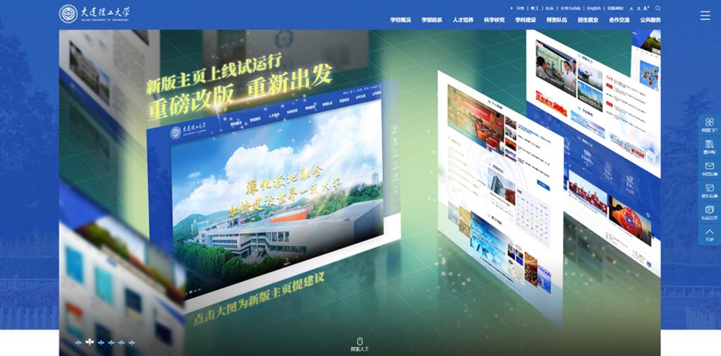 新版中文主页强化了其展示形象的作用,主页banner采用全屏设计,可播放视频,视觉效果更加震撼。聚焦一流建设,“大工新闻”版块更加醒目,同时增设以人才培养、科学研究等重要新闻为主的“教学科研”版块,集中展示学校改革发展动态和一流大学建设成果。突出对外宣传,增设“媒体大工”“数据大工”版块,展示学校紧扣时代脉搏、服务国家建设的奋进足迹。推进媒体融合,增设“全媒体矩阵”版块,展示学校传统媒体与新兴媒体全方位融合的优秀作品。