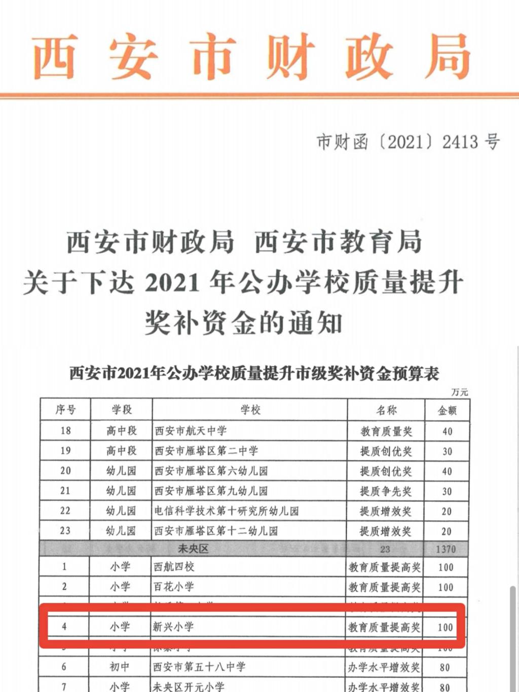 继续教育培训网首页按照《西安市公办学校质量提升奖补资金管理办法(试行)》和《西安市公办学校质量提升奖补考核办法》,经西安市专家组评审,陕科大附小新兴小学被西安市教育局评为2021年“教育质量提高奖”学校,获得最高100万元资金奖励。