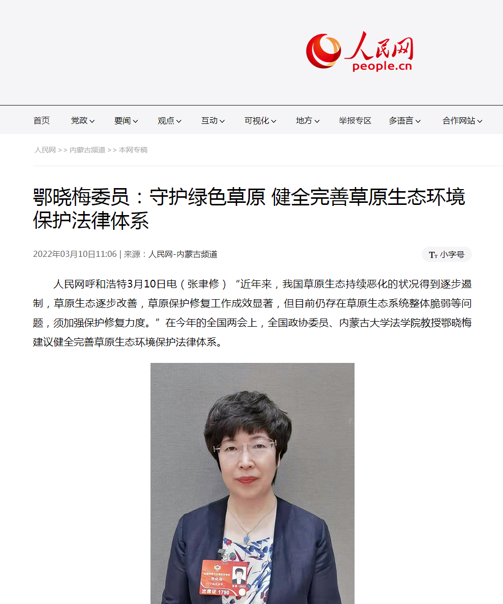 人民网:鄂晓梅委员:守护绿色草原 健全完善草原生态环境保护法律体系(点击图片查看原报道)