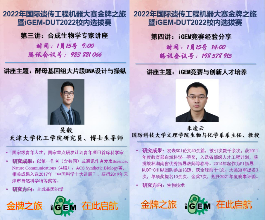金牌之旅培训历时整个寒假,由生物实验教学示范中心和校iGEM社团承办,利用B站和腾讯会议等多种载体,以云端课堂的形式,组织了合成生物学导论、iGEM专题讲座、文献调研、选题与组队等九个专题的学习讨论,为学员系统介绍合成生物学、iGEM竞赛和经典案例,指导学生完成项目组队、头脑风暴和选题立项。