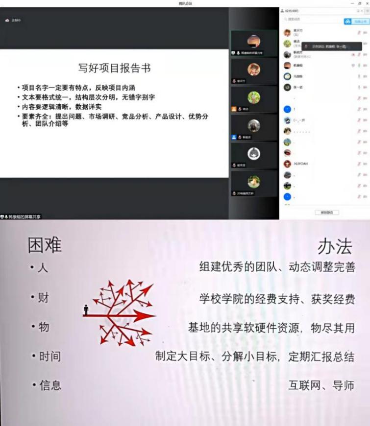 就大赛申报具体要求,韩康榕老师详细讲述了如何写好项目计划书、做好路演、PPT等实用经验,并结合实际,指出优秀的团队需要的五个要素,预判了立项过程中会遇到的五个问题并予以解答。