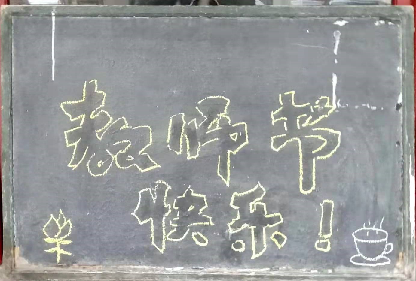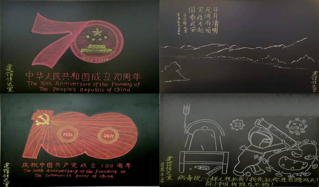 “我的画是成年人的儿童画,”毕师傅开玩笑地说,自己喜欢绘画,但没有经过专业学习和训练,因为工作总需要写通知,在仓库寻得一块小黑板,索性将爱好付诸实践。于是,在2016年教师节创作第一幅板报,平时利用零碎时间自学,还会请建艺学院的老师和学生指导,作品积累越来越多。在庆祝新中国成立70周年、建党百年等重要时间节点,教师节、妇女节等重要节日,学生们都能看到毕师傅的作品。7年间,毕师傅已创作板报91幅。被学生誉为“板报大爷”。