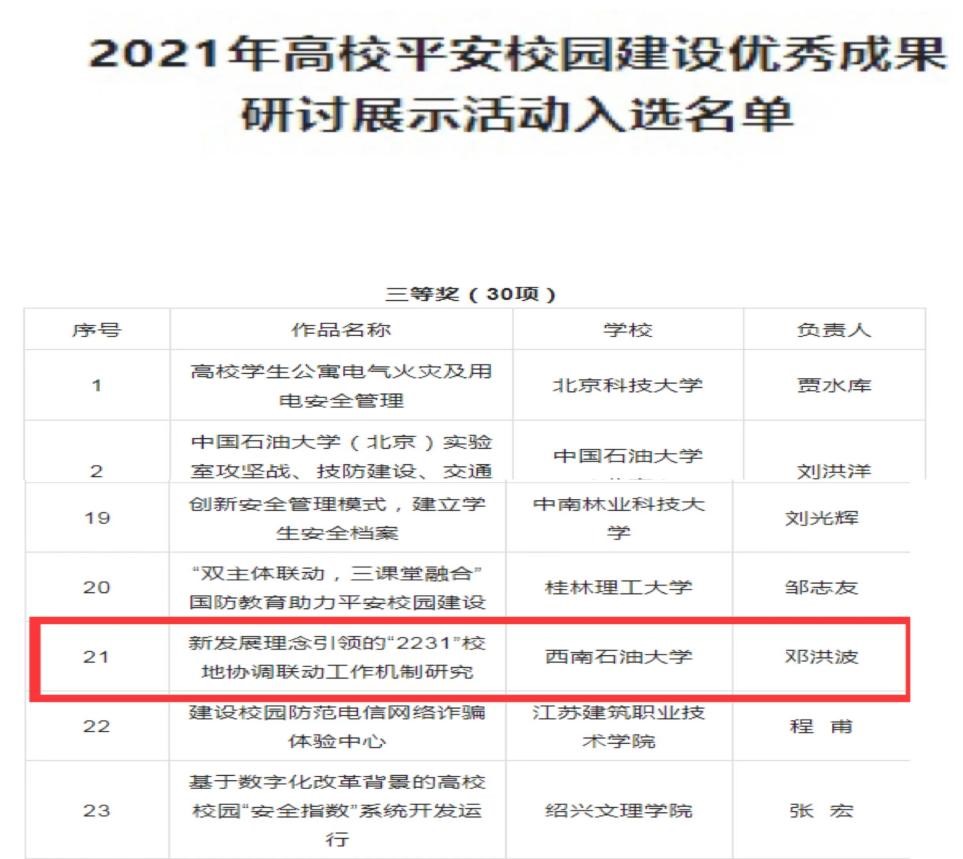 继续教育培训网首页近日由全国高校思想政治工作网、中国高等教育学会保卫学专业委员会、全国高校思想政治工作队伍培训研修中心(高等教育出版社)联合举办的2021年高校平安校园建设优秀成果研讨展示活动上,我校保卫部(处)(武装部)部(处)长邓洪波主持项目“新发展理念引领的‘2231’校地协调联动工作机制研究”获典型案例类三等奖。