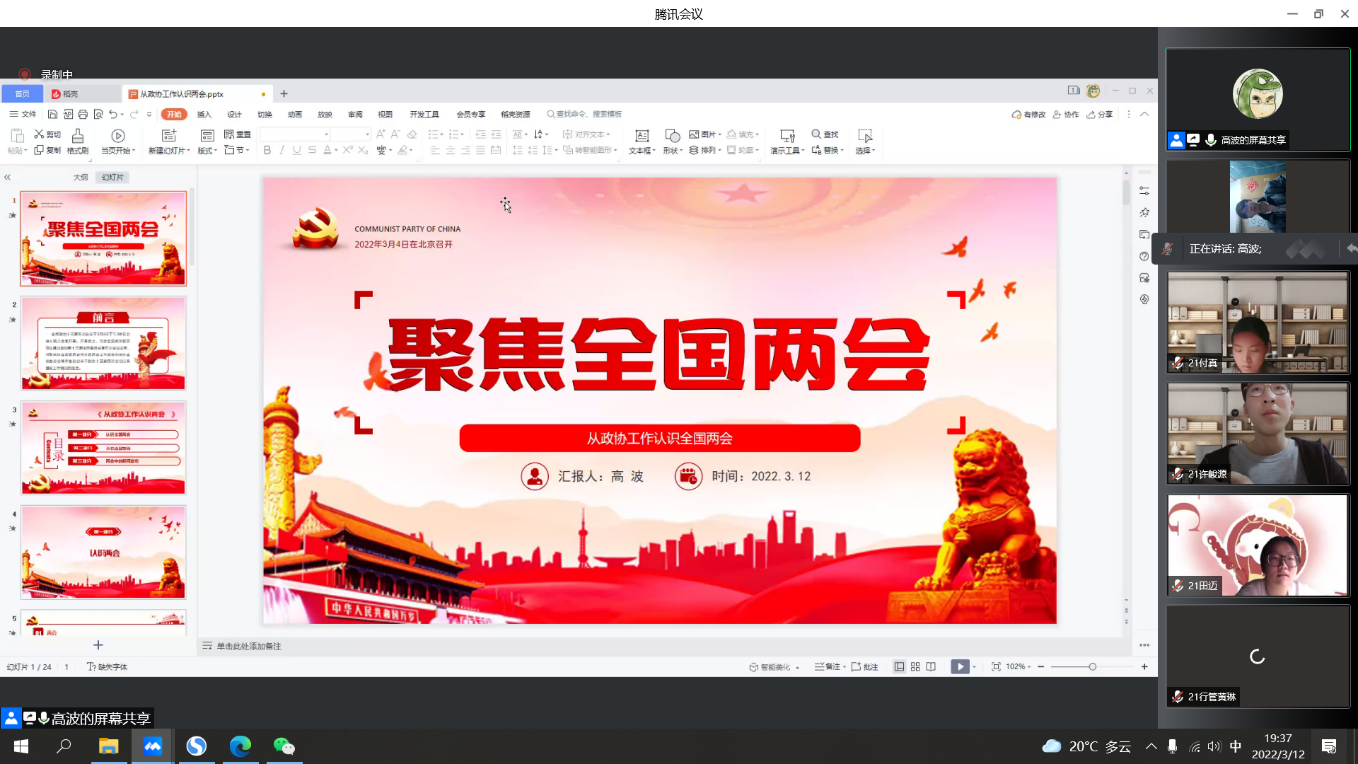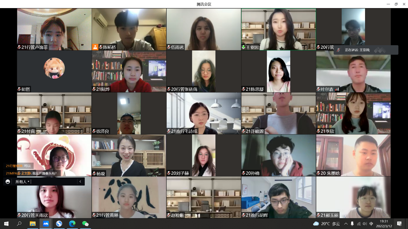 两会伊始,学院团委以“青年学子讲两会”为旗帜,号召各团支部集中观看收听、集中学习,通过党员领学、团员分享讨论等方式,帮助学生吸收和内化两会知识。3月12日,公共管理系高波老师结合自身连续两年服务两会新闻发布工作的亲身经历,从国家治理体系建设的专业角度给政院学子带来了一堂生动的两会知识讲座,“政院教师话两会”再次引发同学们学习热潮。3月19日,深圳市政协委员、深圳广播电视电影集团首席评论员余治国作为“媒体记者谈两会”嘉宾与大家线上交流互动。余治国委员以聚焦两会报道中新闻媒体“四力”为主题,引导同学们从专业领域深刻体会与学习两会精神,将“两会政院青年说”系列活动推向高潮。