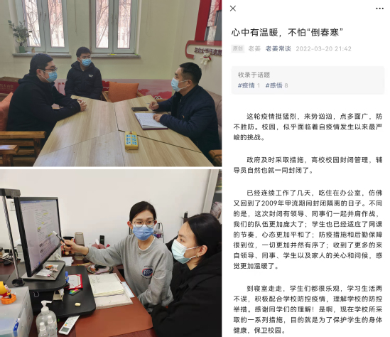 同样作为就业工作“老兵”的外国语学院就业辅导员姜铭奎,他的“老姜常谈”公众号已圈粉无数,“不草率做选择,不轻易说放弃”“心中有温暖,不怕‘倒春寒’”等推文将经验、信心与希望送到求职毕业生们的心坎上。