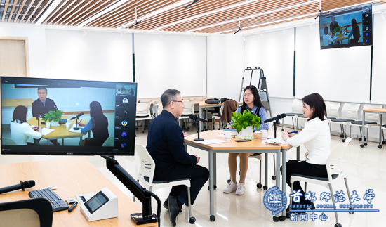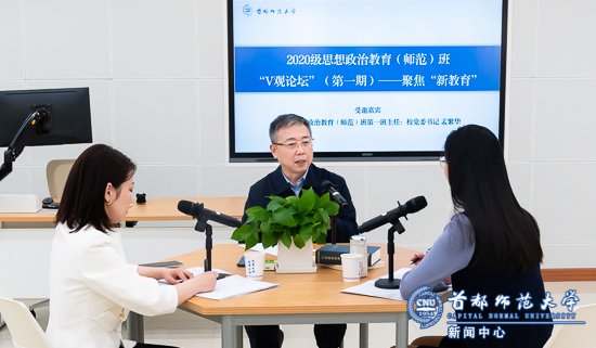 随后,聚焦“新教育”名师访谈活动拉开帷幕。在校学生代表胡雅涵就教育理念、教育经验等同学们关心的问题与第一班主任孟繁华展开访谈。