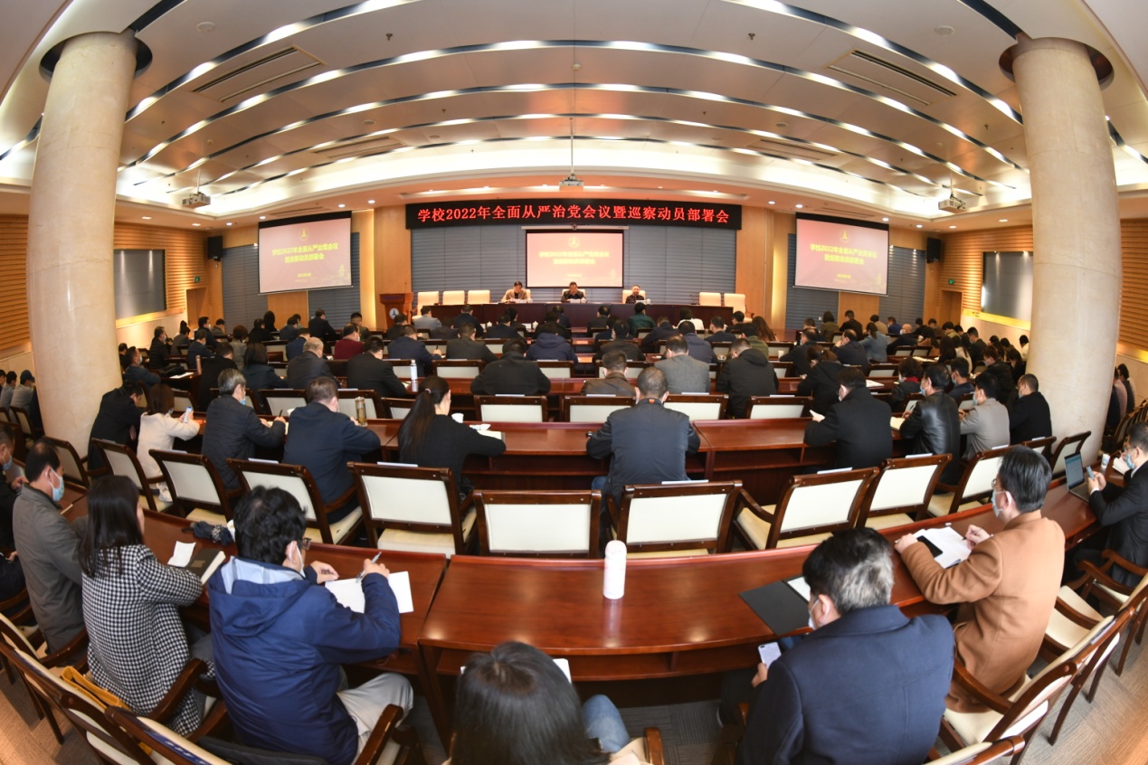 栾永玉传达了中央和上级党组织关于全面从严治党的新精神,全面回顾总结了我校2021年全面从严治党和校内巡察工作。他指出,2021年,学校党委坚持以党的政治建设为统领,坚决扛起管党治校的政治责任,加快推进学校“双一流”建设和内部治理现代化进程,以全面从严治党新成效引领和保障学校各项事业高质量发展,实现了“十四五”良好开局。