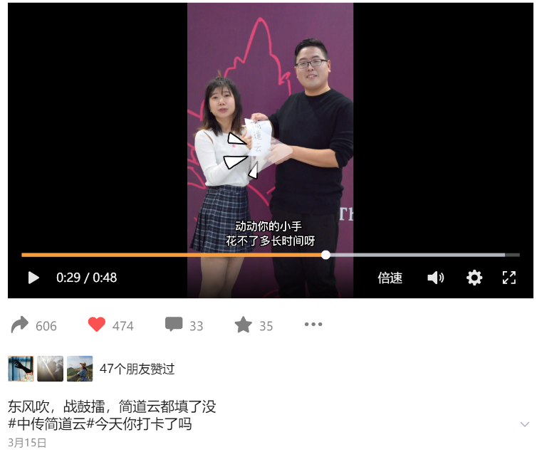 学院开展了多种形式的疫情防控宣教工作,将专业特色与疫情防控相结合,由辅导员吴亚楠老师和张波老师出镜拍摄小视频,提醒同学们简道云按时打卡。
