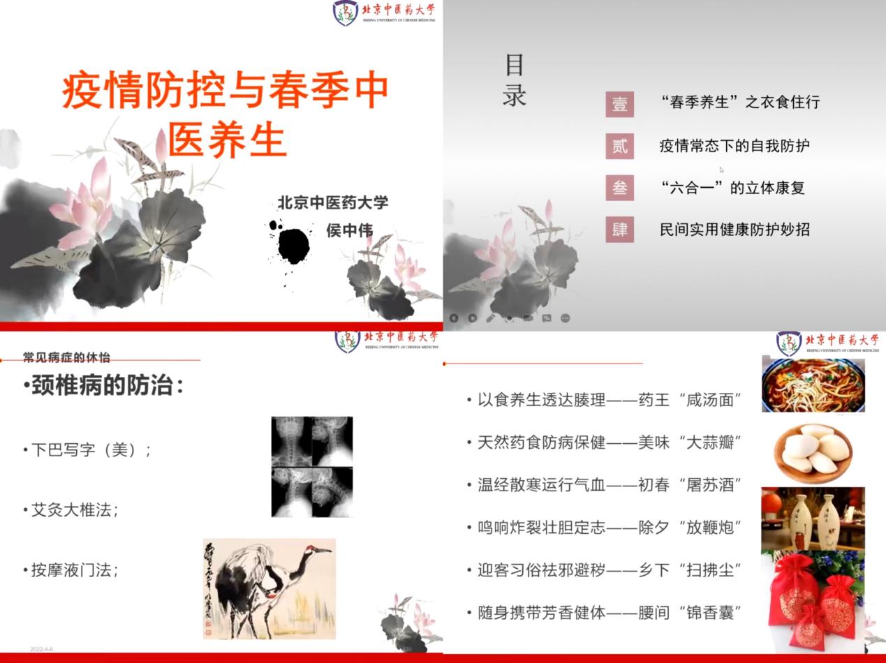 继续教育培训网首页4月4日下午,“中传教师发展活动月”第二场活动之“疫情防控与春季中医养生”专题讲座成功举办。活动邀请北京中医药大学教授、针灸学博士、副主任医师侯中伟主讲,全校230余位教师在线参加活动。讲座由党委教师工作部部长王晓丽主持。