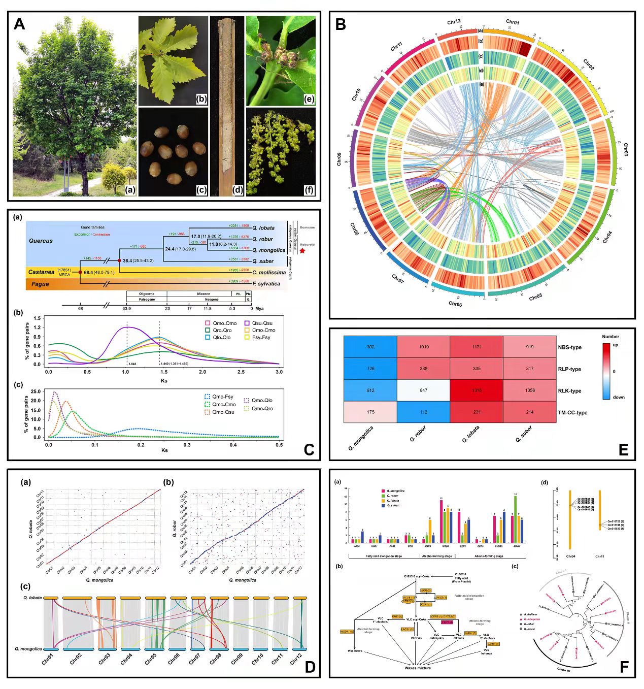 图A 蒙古栎的特征;图B 蒙古栎基因组的特征;图C 蒙古栎基因组进化分析;图D 3种白栎基因组共线性分析;图E 4种栎属物种R基因的鉴定与比较;图F 4种栎属物种角质层蜡生物合成途径关键基因的鉴定和比较