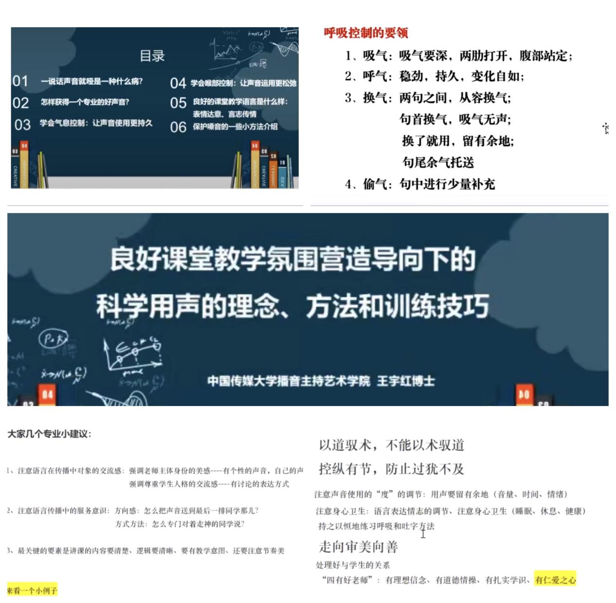 继续教育培训网首页4月8日下午,“中传教师发展活动月”第三场活动之“科学发声与教学艺术(第一讲)”专题讲座成功举办。活动邀请中国传媒大学播音主持艺术学院副教授、硕士研究生导师、国家级普通话测试员、博士王宇红主讲,全校180余位教师在线参加活动。讲座由党委教师工作部副部长霍淑芬主持。