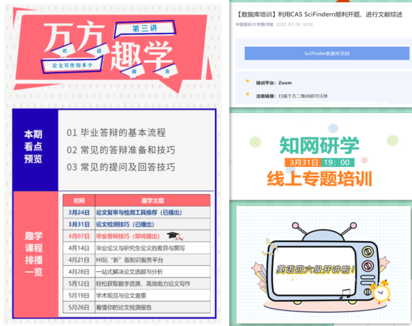 通过知网、万方、CAS、中科数据库提供的线上关于科研写作、英语考试等相关专题在线培训帮助读者解决学习与科研难题。