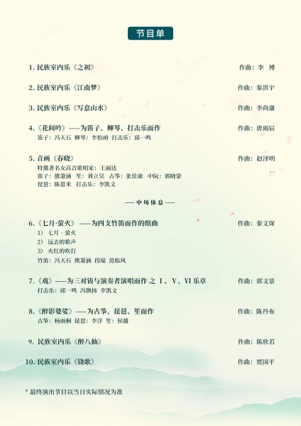 音乐会上,乐团将携手当代作曲家,推出兼具审美与学术的民族室内乐精品力作,展现作曲家们多年来对民族音乐发展的思考与展望,凝聚乐团对民族音乐的传承与创新,对新民乐的思考与探索。