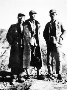 1937年在延安,吕骥(左)与在抗大、陕公从事音乐工作的魏克多(中)、张益珊合影
