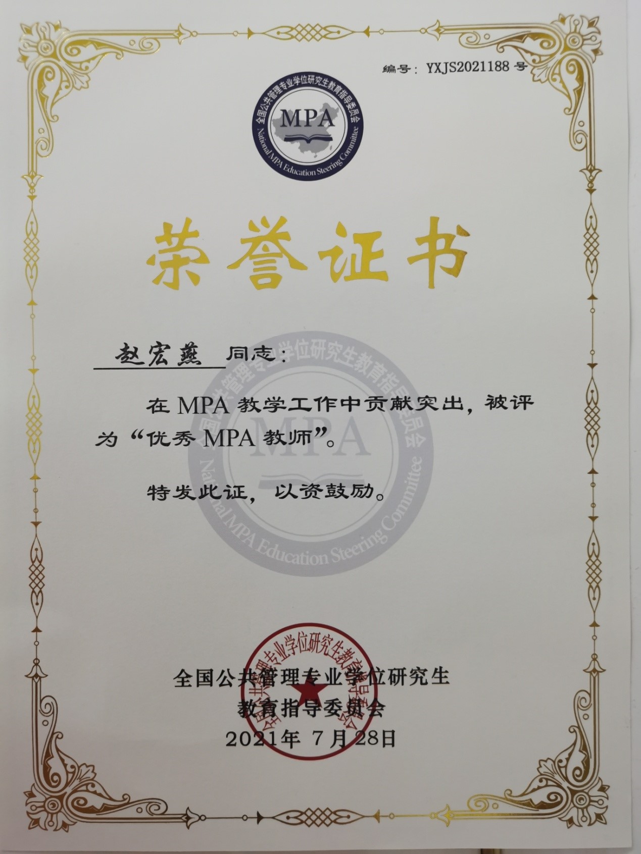 继续教育培训网首页为表彰在 2015年至2021年期间对MPA教育作出突出贡献的教师,全国MPA教指委于2021年5月启动了全国MPA优秀教师的评选活动。根据《全国MPA优秀教师评选办法》,我校从符合条件的教师中进行选拔并推荐到全国MPA教指委,经过对申报者的初评筛选、专家评选等环节,我校公共管理与法学院副院长赵宏燕获此殊荣。教指委于近日颁发了“全国MPA优秀教师”荣誉证书。赵宏燕分管我校MPA中心的各项工作。2018年,她带领专业教师圆满完成了专项评估工作,并对我校MPA的招生、教学、学生管理及论文等环节均作出了重要贡献。由于教学效果突出,她于2017年11月应全国MPA教指委的邀请,在全国《公共管理学》课程培训会上进行授课经验分享。2018年和2020年,赵宏燕撰写的两篇公共管理案例收录中国专业学位案例中心案例库,所指导的学生参加第二届和第四届“中国研究生公共管理案例大赛”,分别进入了全国百强和十六强,并获得全国“最佳案例”的好成绩(全国1900多个案例仅有四篇案例获得最佳案例),她因此被评为“中国研究生公共管理案例大赛最佳指导教师”,应教指委的邀请,在全国案例大赛培训会上进行案例指导经验的分享,并作为案例大赛的评委。赵宏燕所指导的论文连续两年获得校优秀硕士论文,并参评全国优秀MPA论文。