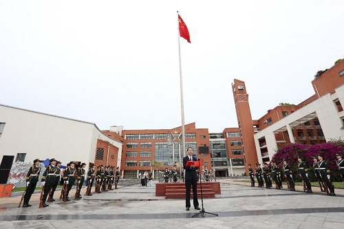 仪式伊始,身着军礼服、英姿飒爽的国旗护卫队迈着整齐的步伐,昂首挺胸,护卫着鲜艳的五星红旗入场。伴随着庄严的国歌声,队员们肃立敬礼,现场师生高唱国歌,目送国旗冉冉升起,迎风飘扬。