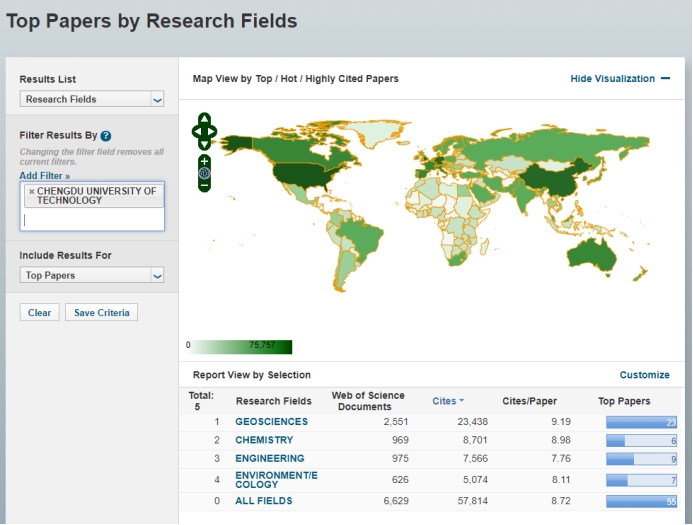 根据此次最新公布的ESI数据(数据统计区间为2012年1月1日至2022年2月28日)显示,成都理工大学在化学领域,共发表WOS论文969篇,总被引频次8701次,篇均被引频次8.98次,6篇入选TOP论文。全球入围ESI化学学科的机构有1551所,我校在国际学术机构排名第1527位。