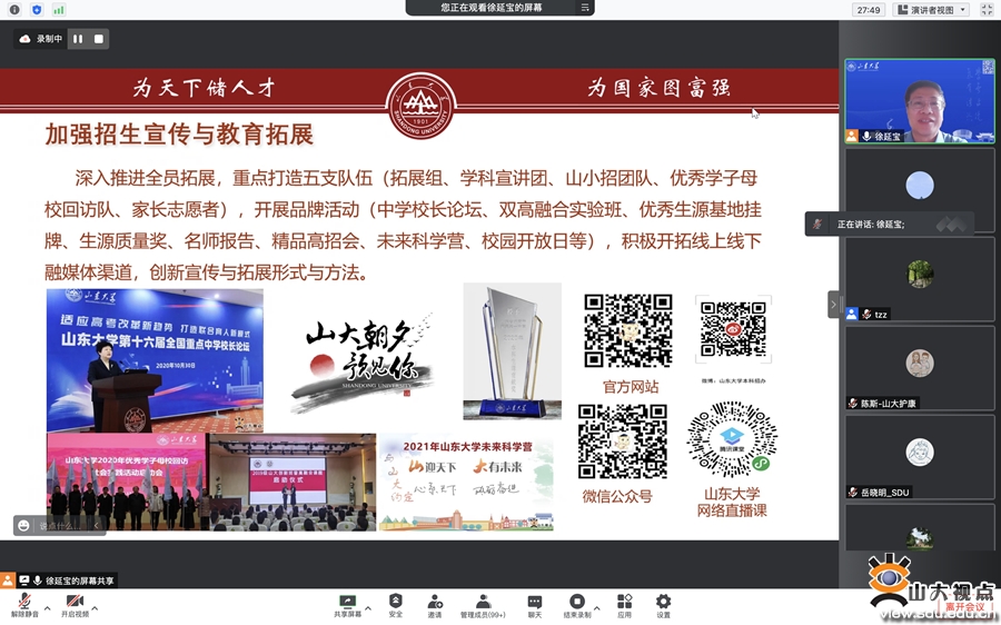 继续教育培训网首页5月19日下午,为做好2022年度学校本科招生教育拓展与宣传工作,延揽优秀生源,提升人才培养质量,山东大学本科招生教育拓展启动暨培训会在线上举行。