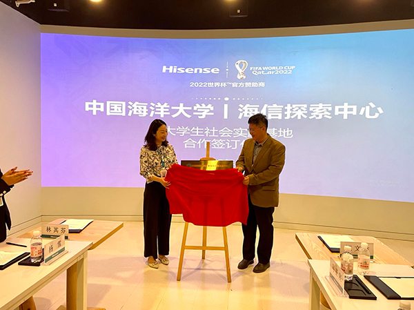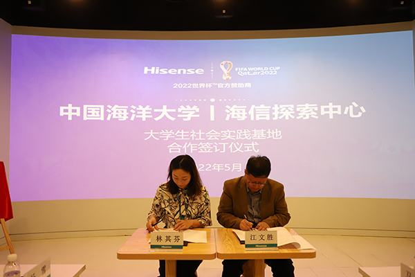 参观完毕后,双方落座于会议室,由江文胜与林其芬一同签署合作协议,为合作基地进行揭牌,共同畅谈本次合作的机缘与未来的美好蓝图。林其芬表示,自己作为一名海大学子,对母校甚是怀恋与感激,并高度赞扬了海大学生的综合素质与精神面貌,期待与学院合力一同升级优化现有科普项目,丰富海洋元素,加强海洋专区的规划建设。江文胜表示,本次大学生社会实践基地的合作对推进海洋教育和人才培养有重要意义,并对海信探索中心加入海洋物理、生物、地质等元素提出相关建议,表达了对未来双方合作的期待。党委副书记刘慧表示,期待与青岛海信科技文化管理有限公司就大学生社会实践、实习实训、志愿服务等多方面开展进一步合作,学院为公司输送优秀人才,公司为学院学生提供实习实践机会。校企双方交流气氛热烈而欢快。