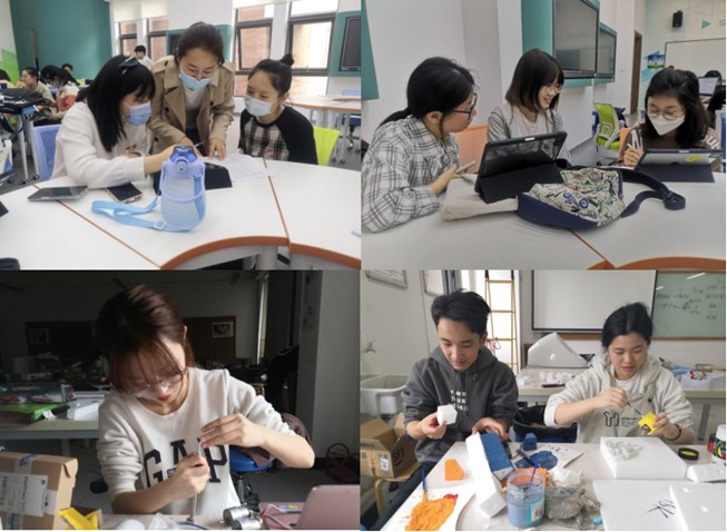开课期间,实践过程中大然科技有限公司总经理张春松、技术主管李欣然在线上给予技术指导;授课教师宋晓菲与朱黎明在线下与同学们交流方案、指导跟进,确保产品开发顺利完成。同学们通过创新主题设计、亲自动手连接元器件、编写程序、制作样机等环节,有效提升了设计思维和创新开发意识,锻炼了自主学习、团队合作、交流表达以及动手实践开发等多项能力,为成为新时代的设计师夯实基础。