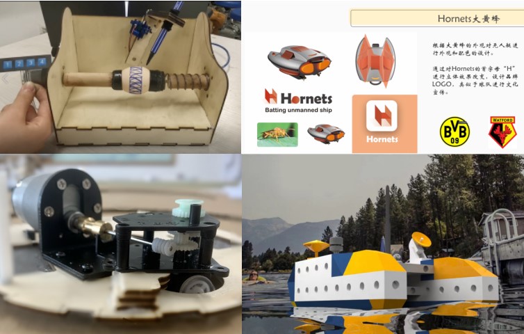 为了鼓励学生们突破创新、追求卓越,本次课程还进行了优秀作品评选,评出了一、二、三等奖并由大然科技公司为获奖学生颁发奖金。同学们的创意作品有基于提升用户DIY彩绘愉悦体验的彩蛋纹样绘制辅助机器人;有将音乐的五感体验延伸至视觉的“律动”桌面小音箱;有疫情环境下通过花这一自然生机意向进行心理疗愈的互动装置;有具有模块化演示教育功能的个性化无人艇;有可以在城市水域进行水面清洁的智能清道夫及水上足球竞技无人艇;也有解决宿舍反复上下床关灯问题的自动熄灯器;还有具有自动吸尘与避障功能的扫地机器人。评委老师们就设计方案的创新性、原型制作的可行性以及项目推进的效率等方面给予同学们多项指导建议。