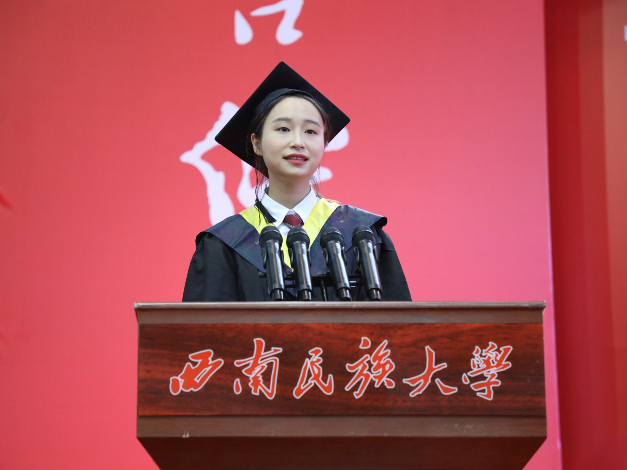 建筑学院2017级建筑学专业周禾晗同学代表全体本科毕业生发言。她分享了本科四年时光如何向阳而生、厚积薄发、一往无前,表达了对母校、师长、同学的感恩和不舍之情。毕业研究生代表、计算机科学与工程学院2020 级农业工程与信息技术专业邢雪枫同学深情回顾了在民大求学的2640天,与毕业生们共勉要带着青春的梦想,求知的热忱,报国的热血勇往前行。