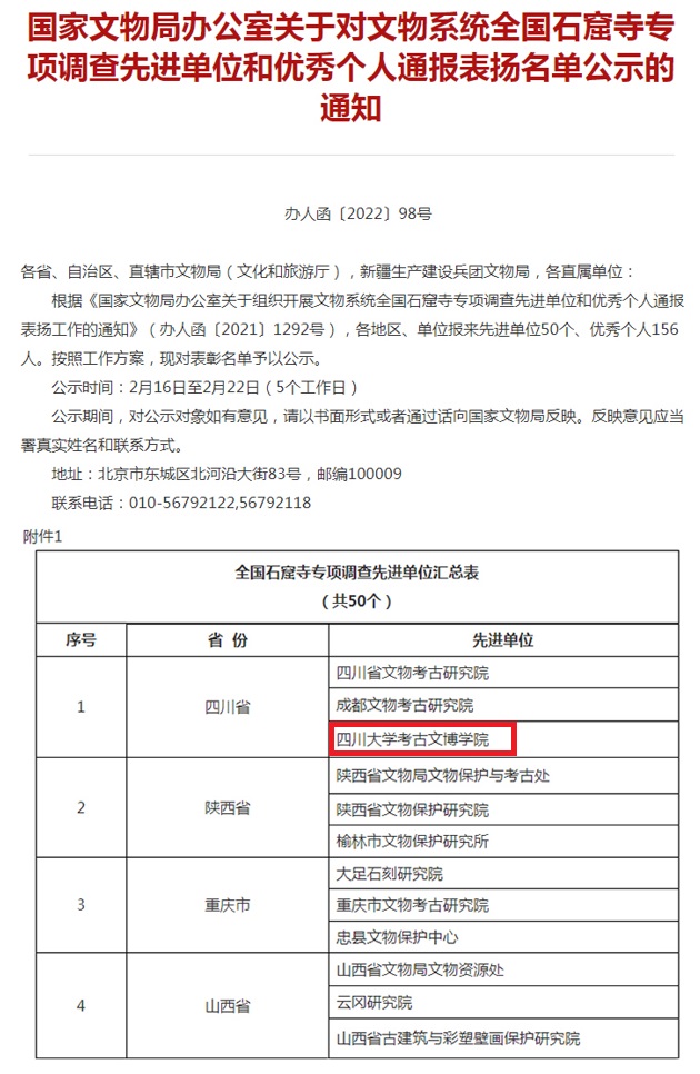 继续教育培训网首页日前,国家文物局决定,对全国石窟寺专项调查工作中作出重要贡献、表现突出的50个先进单位和156名优秀个人予以通报表扬,四川大学考古文博学院作为全国仅有的两个高校单位之一荣获表彰。