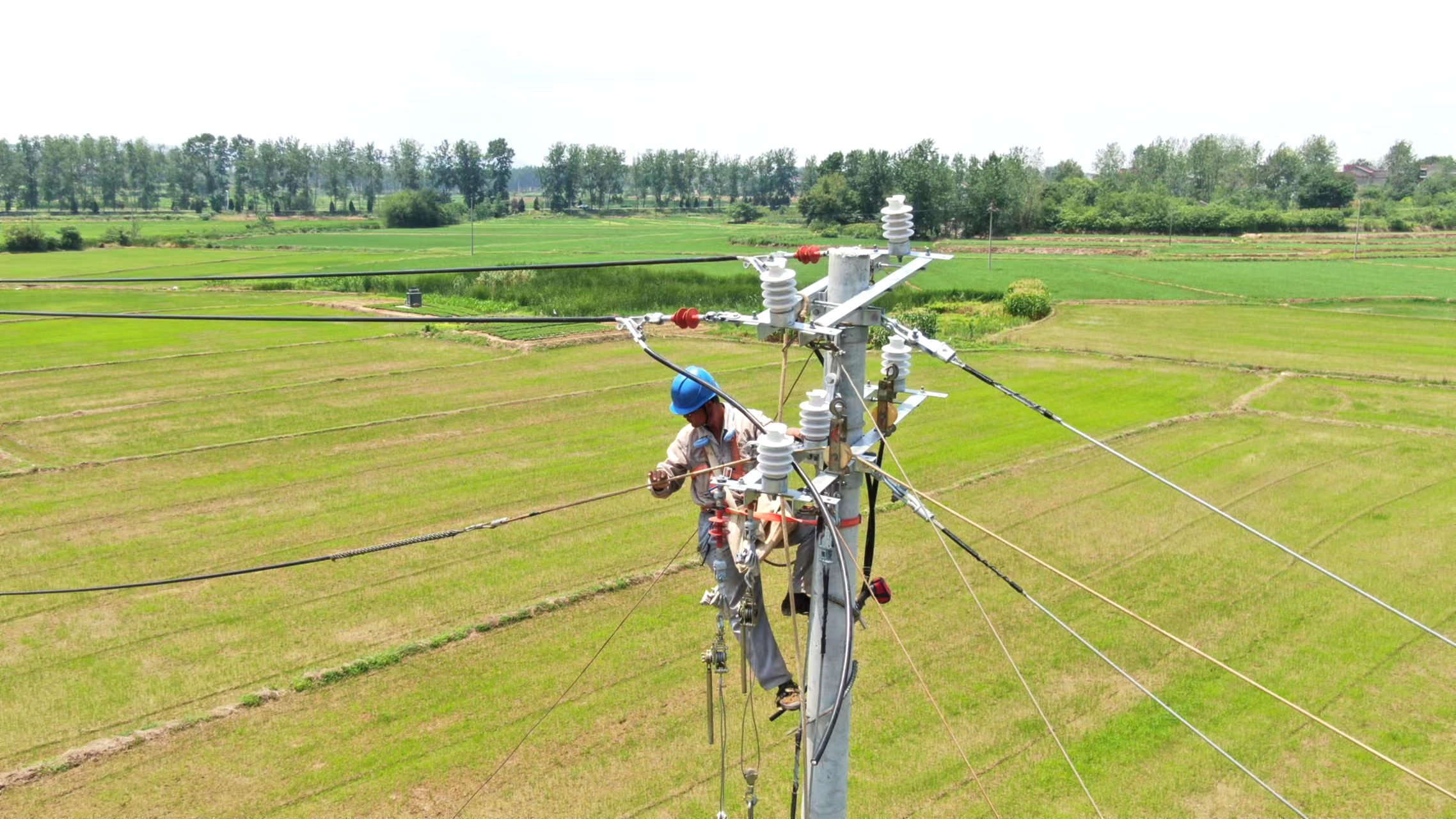近日,安徽省马鞍山市国网含山县供电公司12名施工人员不惧高温,在新建10千伏骆集110线#8-#17杆进行导线架设施工。