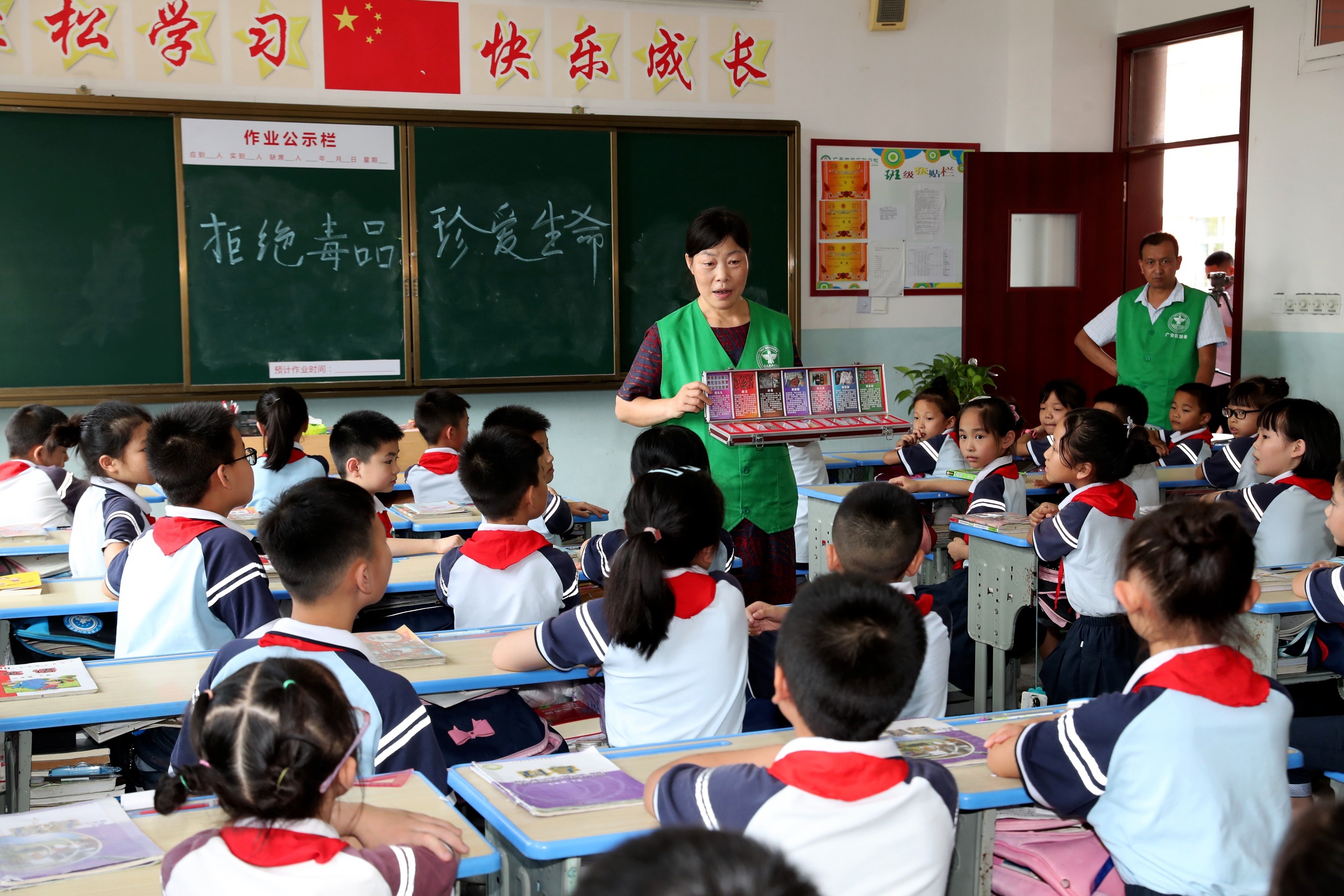 在广安区东方小学校,禁毒服务中心工作人员正在教学生辨别毒品。