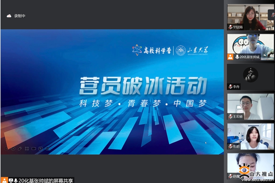 晚上,开营破冰活动如期举行,营员以班级为单位进行了朋辈交流。来自天南海北的科学营师生相聚云端,进行自我介绍,分享参营感受,探讨科学理想,增进了彼此之间的交流和了解。