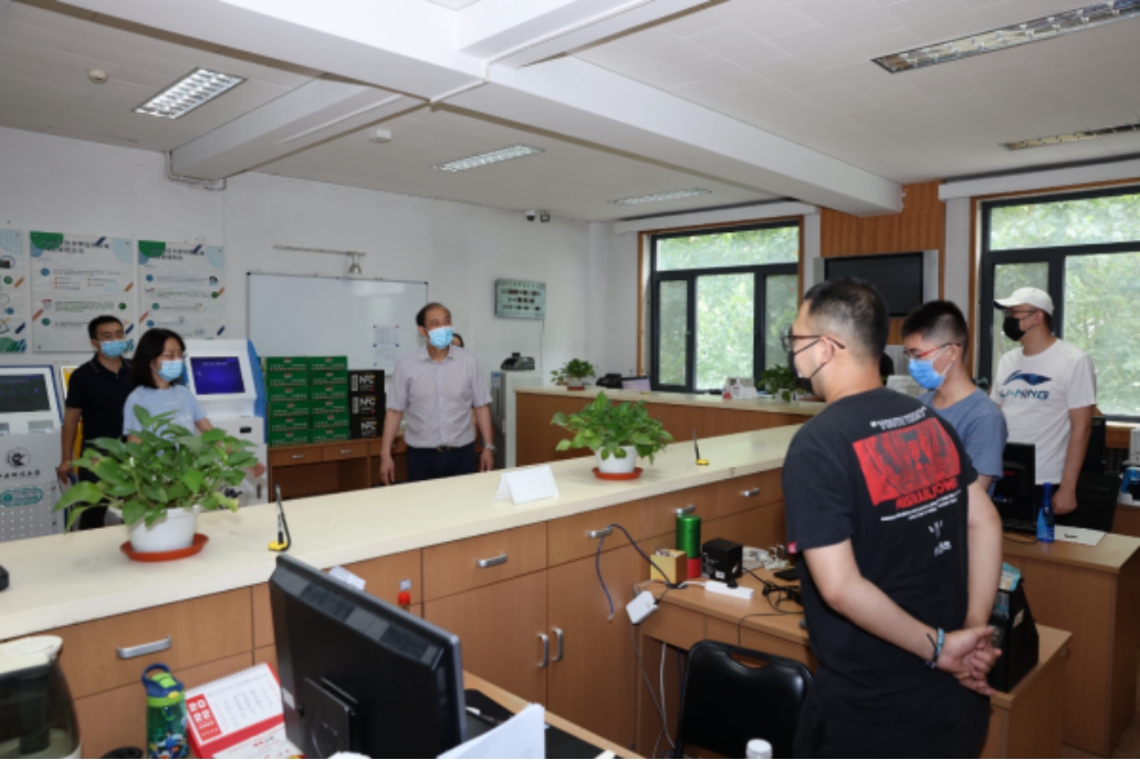 7月22日,何秀超一行走访了学院南路校区学校办公室、学生处、保卫处南门值班室、基建处、智慧校园建设中心用户服务中心、食堂、校医院和汇金酒店,详细询问了招生就业、校园安保、基础设施建设、网络服务、餐饮和疫情防控等工作情况和工作人员生活情况,代表学校对坚守一线的同志们致以亲切的问候,对大家战高温、斗酷暑、恪尽职守、主动担当作为的奉献精神致以诚挚的谢意和充分的肯定。何秀超每到一处都与工作人员亲切交流,叮嘱他们持续绷紧疫情防控这根弦,保障学校暑期的安全稳定和各项工作正常运转,并嘱托他们在做好工作的同时也要注重防暑降温,做好自身防护,安全顺利地度过高温时节。