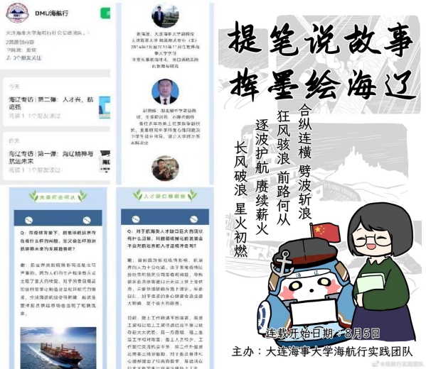 航海学院的海航行团队以“感受招商文化,弘扬海辽精神”为实践主题,对行业进行了深入调研,发放并回收相关调查问卷200余份并进行数据分析。调研过程中开展了多层面的专家访谈,邀请企业和航运类院校专家学者探讨后疫情时代背景下我国航运人才培养问题。通过一系列的实践调研,团队完成了两万余字的调研报告和资政建议。同时,团队还在喜马拉雅APP上进行“海辽精神”和航运知识宣讲广播,前八期累计播放量1000余次,同学们原创设计IP形象和连载漫画发布在相应平台,目前累计浏览量达4000余人次。通过一系列新颖有趣的形式,同学们在帮助广大听众获取知识的同时,还形成了良好的宣传效应。