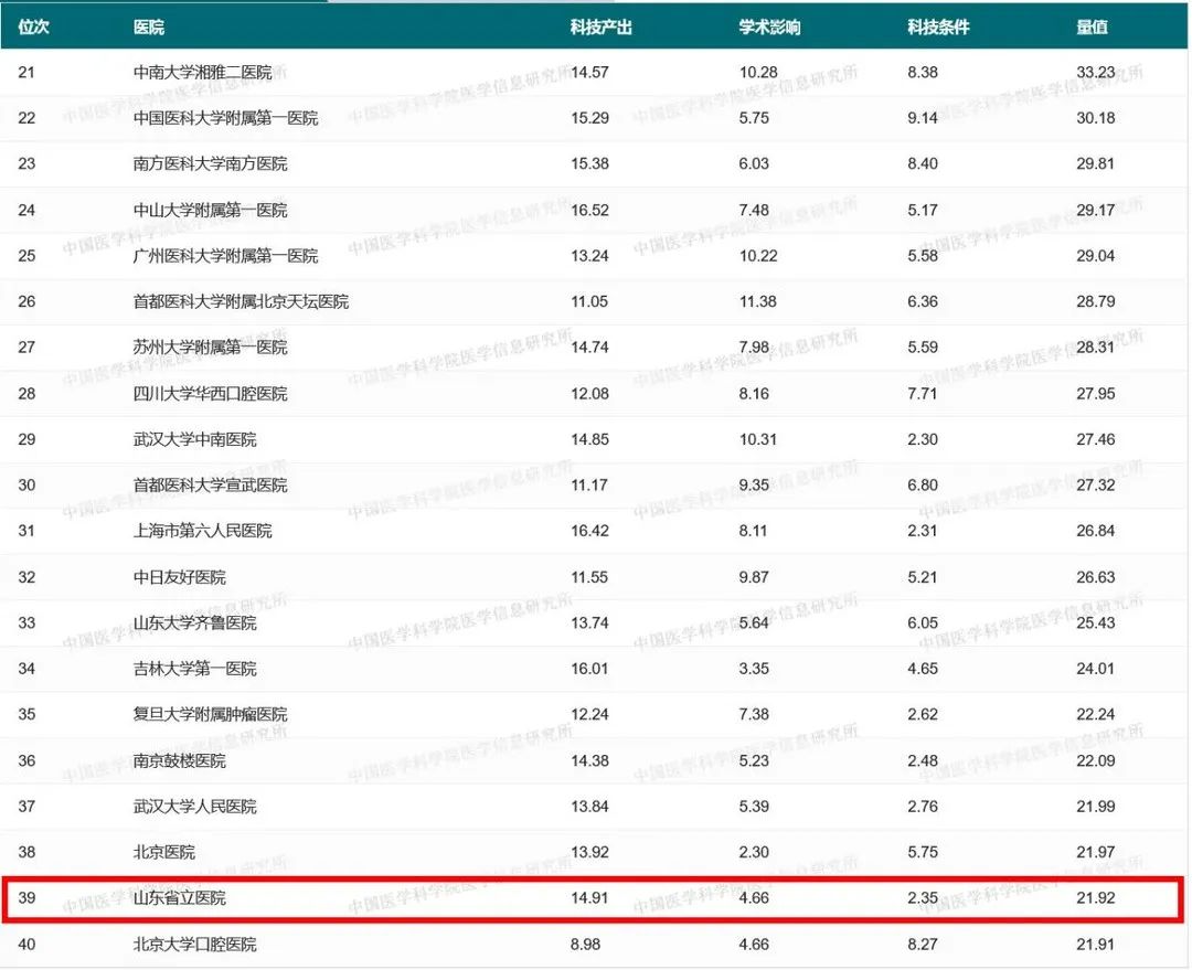 山东第一医科大学附属省立医院(山东省立医院)2021年度科技量值在全国医疗机构中排名第32位,较2020年度提升15个位次,取得历史最好排名,四年提升39个位次;五年科技量值排名第39位,其中,内分泌与代谢病学列全国第7位,儿科学、肾脏病学、心血管病学、护理学进入全国前20名。
