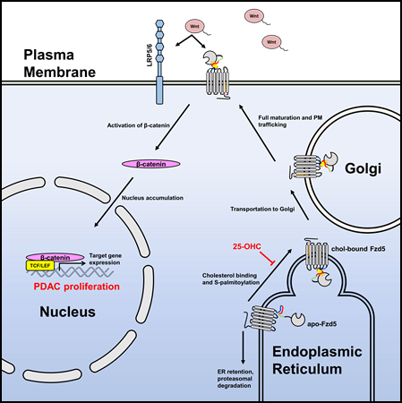 该研究首次揭示了胆固醇与重要受体蛋白Frizzled的相互作用与蛋白棕榈酰化的分子机制,提出了Frizzled5可作为胆固醇传感器连接脂质代谢与关键细胞信号通路从而促进肿瘤增殖的全新概念,并在转化医学上为胰腺癌的治疗提供新的思路和方向。