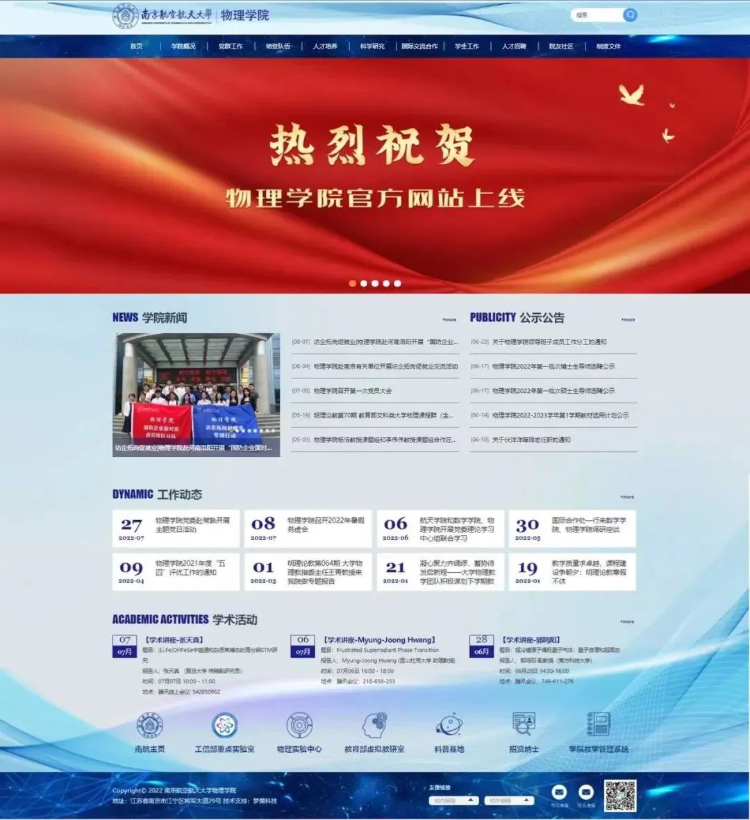 新学院,新气象。在前期充分调研和广泛征求意见的基础上,学院于6月下旬启动了官方网站的建设工作,经过几轮设计修改、编程测试及内容更新,物理学院官方网站即日起正式运行。物理学院官方网站主色调采用南航蓝,融入物理与空天特色。网站包含学院概况、党群工作、师资队伍、人才培养、科学研究、国际交流合作、学生工作、人才招聘、院友社区和制度文件等十个栏目,全面细致地展示了物理学院的全新的风貌。