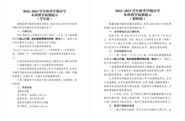 按照预定计划,开学缓补考等考试工作如期举行,共计有600余门课程、3300余名学生、近6000人次完成考试。随着疫情防控形势变化,根据成都市有关防疫工作最新要求,学校对新生报到和学生返校时间适时进行调整。教务处、各学院以及有关部门第一时间响应,及时调整教学安排,明确教学方式,调整拔尖计划选拔等工作,拟定了理论课程采用线上教学和根据实际调整教学方式、实践类课程根据学生返校情况灵活安排等措施。学校发布《四川大学2022-2023学年秋季学期教学温馨提示》,有针对性地对教学的行课时间、方式、准备工作等做详细指引。
