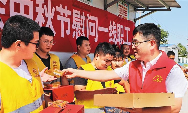 9月9日,中国铁建电气化局三公司党员志愿者带着月饼、水果等,来到京滨城际铁路智能预配中心,慰问一线员工。郑传海摄(中经视觉)