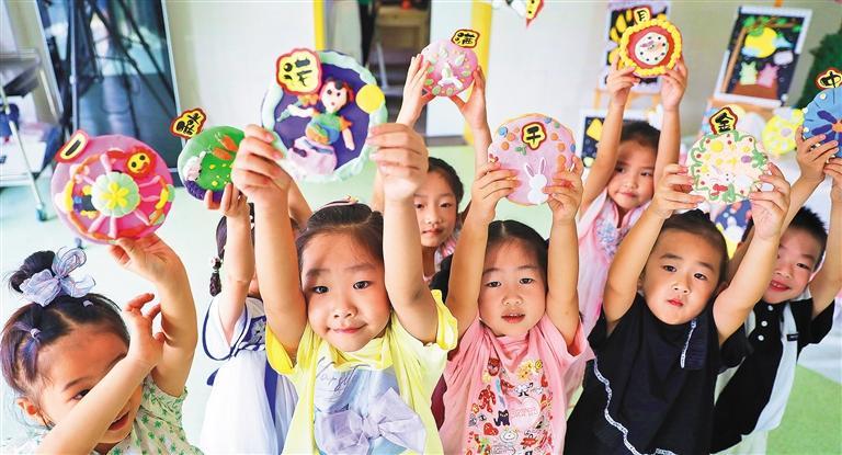9月8日,浙江省湖州市南浔区千金镇幼儿园,小朋友用橡皮泥、贴纸等制作月饼模型。陆志鹏摄(中经视觉)