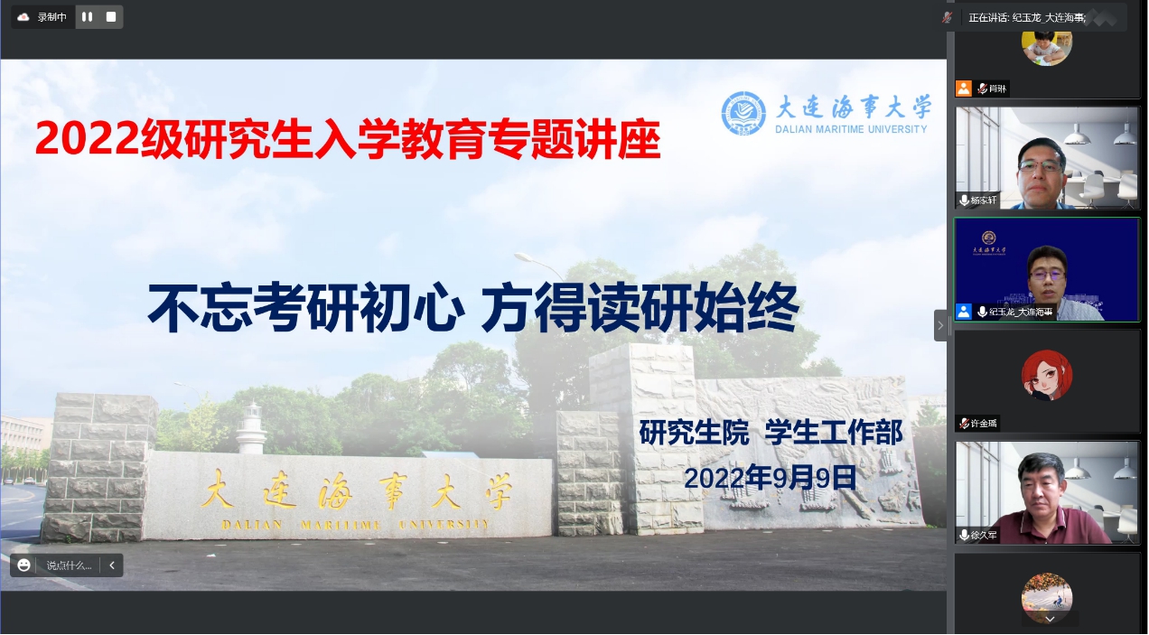 继续教育培训网首页根据学校《关于做好2022级新生入学教育工作的通知》要求,为了保证2022级研究生新生在大连突发疫情、延期进校的情况下,能够尽快转变身份、融入学习新阶段,9月9日晚,我校通过在线方式举办2022级研究生《不忘考研初心,方得读研始终》专题讲座。讲座由研究生院院长纪玉龙主持,交通运输工程学院徐久军教授主讲,全体2022级研究生参加会议,党委学生工作部相关人员、各学院主管研究生教育的副院长、副书记和指导员应邀参加会议。