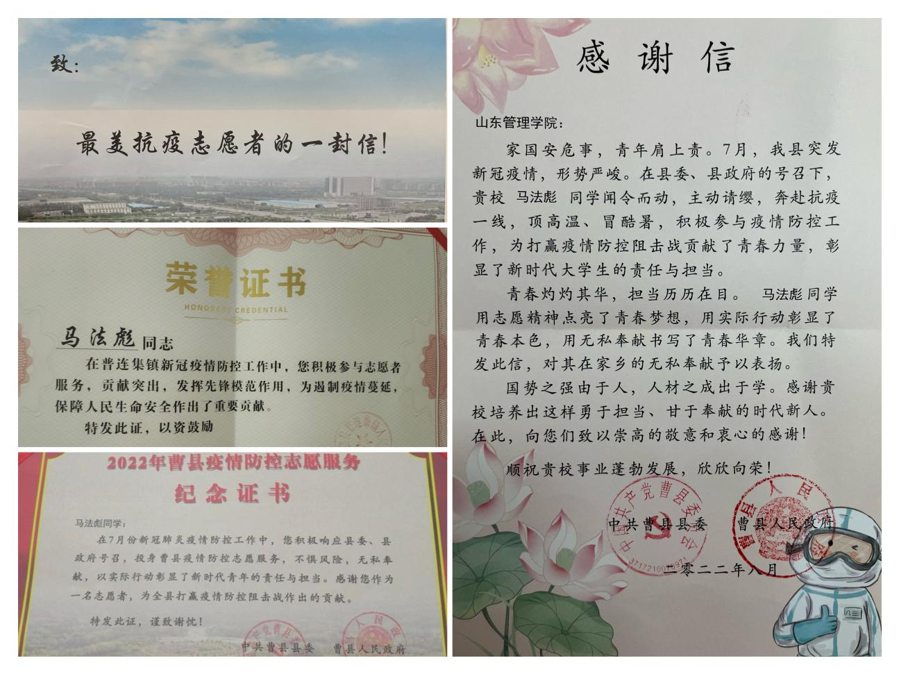 继续教育培训网首页近日,我校收到山东省曹县县委、县人民政府的感谢信,感谢我校信息工程学院2021级信息管理与信息系统专业学生马法彪在曹县突发新冠疫情期间主动请缨,奔赴抗疫一线,积极参加疫情防控工作,为筑牢疫情防线,打赢疫情防控阻击战贡献了青春力量,彰显了山管学子的责任与担当。