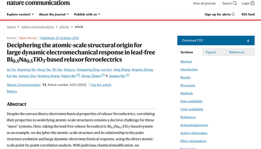 该工作为进一步理解、开发钙钛矿型无铅弛豫铁电体的性能打下了基础,相关成果以Deciphering the atomic-scale structural origin for large dynamic electromechanical response in lead-free Bi0.5Na0.5TiO3-based relaxor ferroelectrics 为题发表在Nature Communications 期刊上。论文第一作者为我校已毕业博士殷杰,我校吴家刚教授为通讯作者,我校为该论文的第一署名单位。西安交通大学、北京理工大学、澳大利亚卧龙岗大学为共同一作和共同通讯单位(施小明研究员为共同第一作者,武海军教授、张树君教授为共同通讯作者)。近年来,基于无铅块体铁电压电陶瓷的构效关联方面的研究,吴家刚团队已在JACS、Adv Mater、Nat Commun、Chem Rev、Chem Soc Rev、Prog Mater Sci等国际高水平期刊上陆续发表多篇论文。