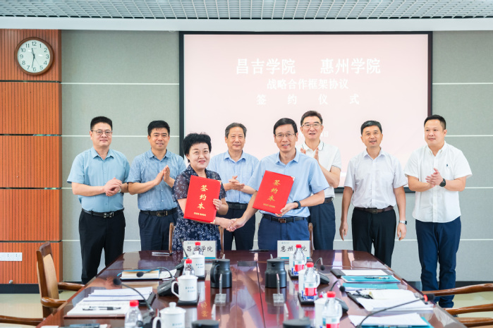 签约仪式前,在王胜的陪同下,昌吉学院一行先后参观调研了惠州学院城市地下工程实验平台、重离子加速器实验室、服装学院及教学成果展,深入了解我校办学特色与科研、教学成果。