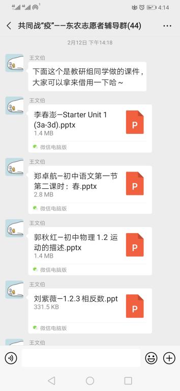 王文伯同学是本次志愿服务活动的组织者,负责对接学生家长。从向支教团成员发布通知、征集授课信息,到与医护人员对接沟通,王文伯首先把抗击疫情的责任落实到在电脑上敲出的每一句话、每一个字。她说:“虽然我不是驻守在医院的医护人员、不是小区里的一名青年志愿者,但此时此刻,我作为研究生支教团的一员,也在以自己的方式为奋战在各地前线的医护人员、为这场疫情狙击战作出我自己的贡献。短短几天内,我与数十名医护人员对接,向他们详细介绍我们这次活动内容及流程,让他们可以放心的将孩子交给我们。在这期间,常常有家长对我说:‘谢谢你们,你们这个活动真的太好了!’、‘我在医院工作太忙了,没时间照顾到孩子的学业,这下我就放心了’...一句句感谢的话语,不仅温暖了我,更让我明白,他们正在身体力行,全力以赴的将希望传递给我们每一个人。”