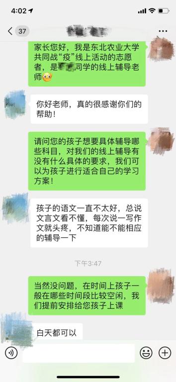 校团委成立专项工作组,先后与哈尔滨医科大学附属第一医院和哈尔滨市第一医院沟通,征求一线医护人员子女学业辅导需求,根据学科、年级及其他具体需求,择优选派志愿者一对一结对。为了尽可能让更多孩子,学校团委还与“兴边富民”计划研究生支教团所在的牡丹江团市委、黑河团市委以及学校所在地哈尔滨市香坊区团委联系,请地方团组织协助对接所在地医院,向疫情防控一线医护人员发布了学业辅导志愿服务报名通知。